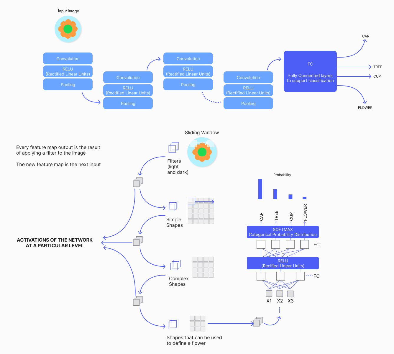 The image shows an example of a neural network with many convolutional layers. Filters are applied to each picture, regardless of its extension. Accordingly, the output of each thumbnail is the input to the next layer. The peculiarity of CNNs is that they learn to identify all sorts of features of an image using dozens or even hundreds of hidden layers. Each of the last layers increases the complexity of the learned features. For example, the first layer detects edges, while the fourth layer finds more complex shapes adapted to the shape of the object we need to recognize.